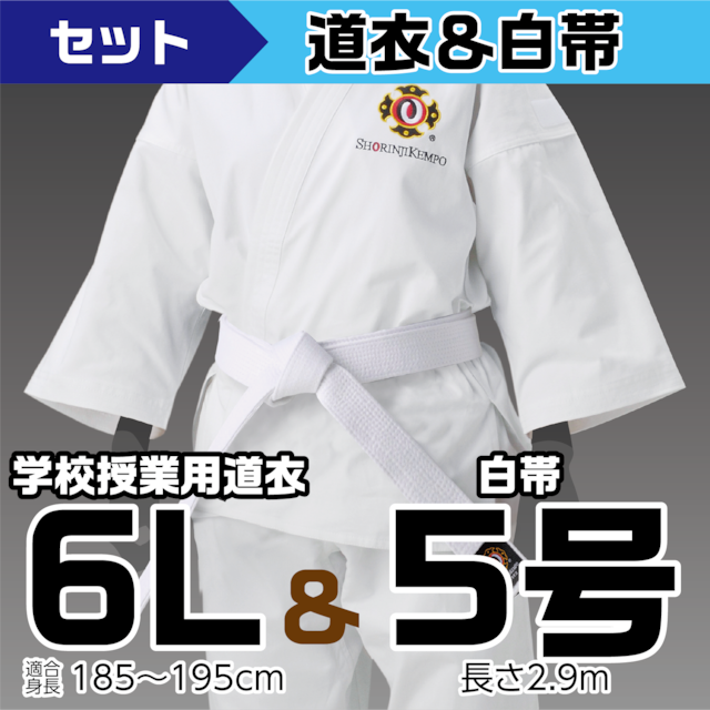 道衣と白帯を一緒にご購入いただけるセット商品です。 ■学校授業用道衣 素材:綿100% サイズ:6L 適合身長:185~195cm 上衣(着丈:95cm、裄丈:83cm) ズボン(ズボン丈:102cm、胴廻り:106cm) ■白帯<5号:2.9m> 幅:40mm 長さ:2.9m 表地:綿100% ※帯の長さには縫製の関係上若干の誤差が生じます。