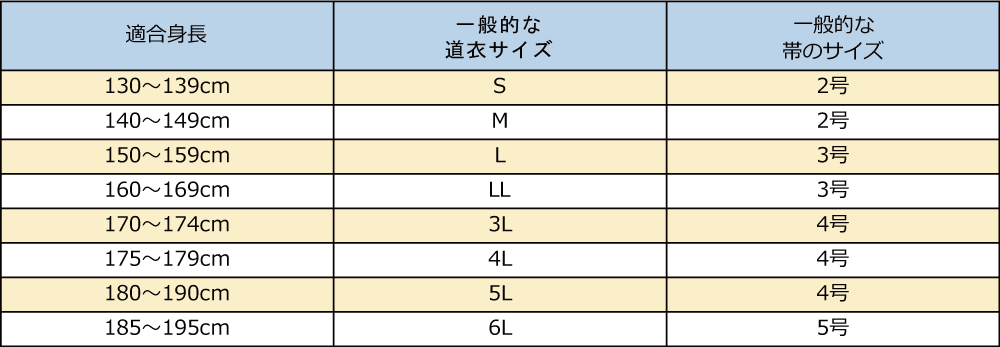 道衣のサイズは原則として身長からお選びいただきます。